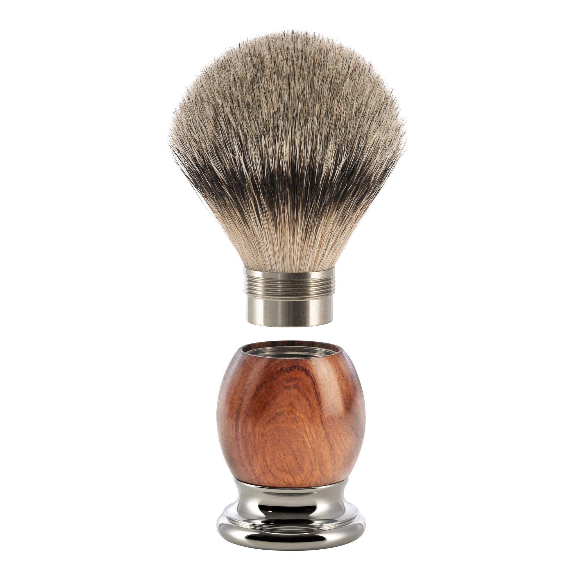 Bewährter Klassiker und unangefochtene Spitze der Naturhaarpalette: Silberspitz Dachszupf ist besonders weich und flexibel und wird bei MÜHLE ausschließlich von Hand verarbeitet. Edle Erkennungszeichen sind die silbern schimmernde Farbe und ein schwarzes Band im Verlauf jedes einzelnen Haares, das Kenner als Spiegel bezeichnen. Das feine, konisch auslaufende Haar nimmt besonders viel Wasser auf und garantiert das Aufschlagen eines dichten, cremigen Schaumes.